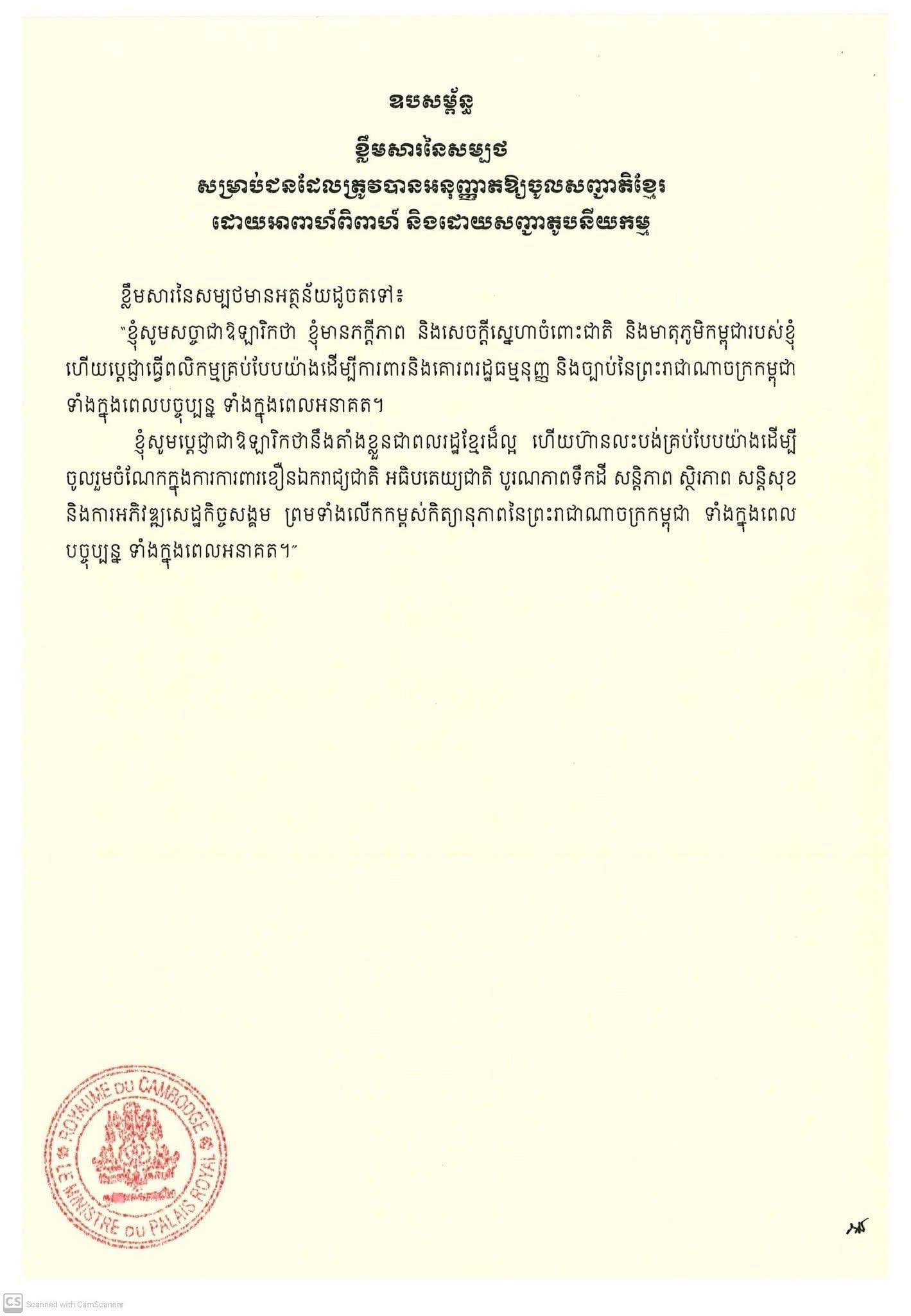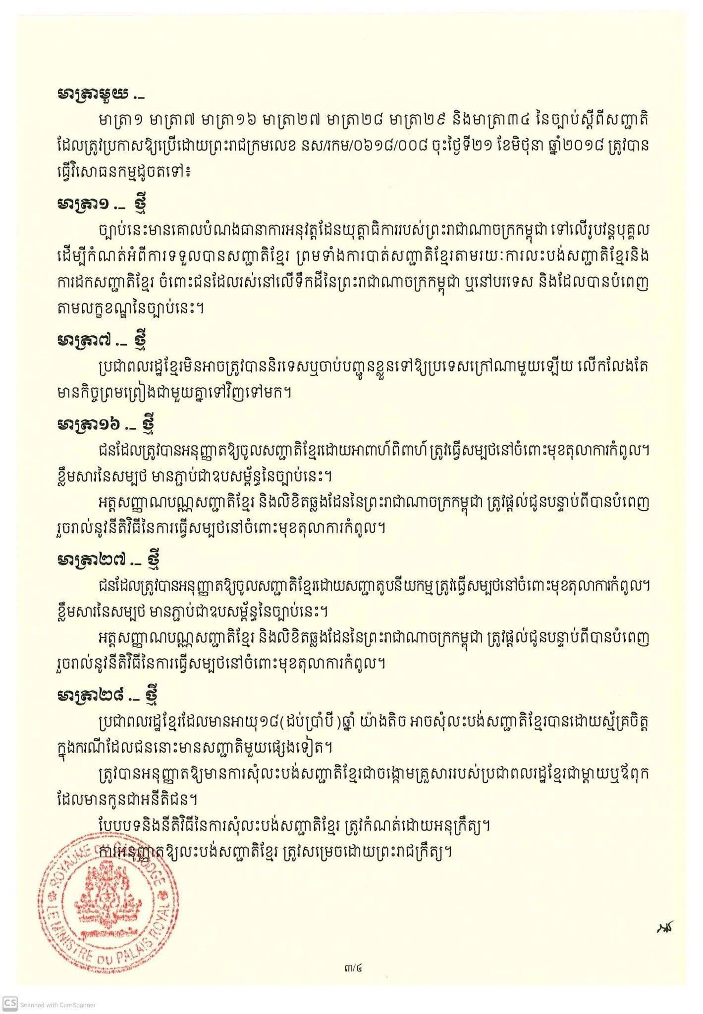 វិសោធនកម្មច្បាប់ ពាក់ព័ន្ធការដកសញ្ជាតិខ្មែរ ត្រូវបានប្រកាសឱ្យប្រើជាធរមាន